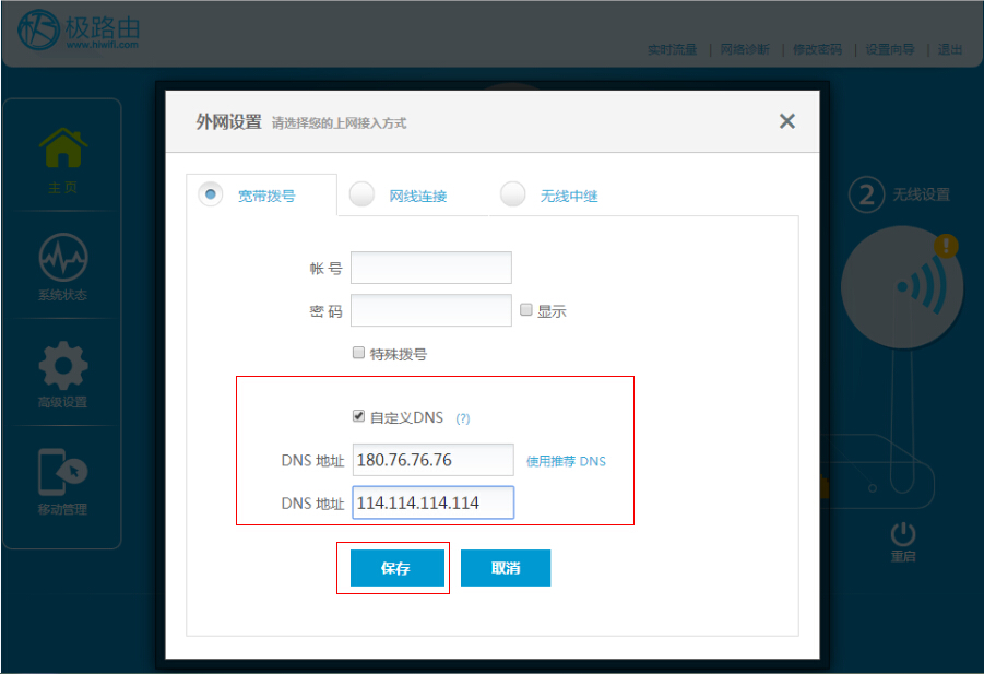 根据上网方式选择宽带拨号或网线接入(多为宽带拨号),勾选"自定义DNS",然后在DNS地址输入框中分别输入180.76.76.76和114.114.114.114,点击保存完成设置